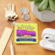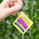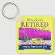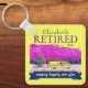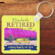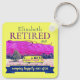 A bright yellow classic retro coach camper with a magenta pink stripe, cruises through a colorful expansive landscape. There are mountains in the background, trees below the rolling hills, and grassland along the road. The campers have plenty of time for their adventure because they are happily retired. The words "RETIRED and camping happily ever after" frame this cheerful artwork. There is also a template for either a name or initials. The design is the same on both the front and back of the keychain.