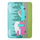 This Retro Camper / Trailer and Car Bath Mat features a mid century modern, minimalist cartoon drawing that will leave you ready to take to the open road. An homage to the 1950s, this design features a vintage turquoise car with white top, pulling a kitschy travel trailer to its final destination. The perfectly restored, retro RV has a hot pink lower half, white top half, and a turquoise lightning bolt separating the two. The door in the side of the camper is also turquoise. The final accent is the hot pink wing protruding from the back of this home on wheels. The happy campers are motoring down a grey road. The roadway is surrounded by lush, green grass. In the background, we can see the teal silhouettes of a veritable forest of cedar trees, against an aqua sky with puffy, light blue clouds. This design is perfect for everyone from retired hippies, fledgling hipsters, or anyone who wants to relive some great childhood memories. The best part is that no one is asking, "Are we there yet?"