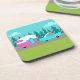 These Retro Camper / Trailer and Car Coasters feature a mid century modern, minimalist cartoon drawing that will leave you ready to take to the open road. An homage to the 1950s, this design features a vintage turquoise car with white top, pulling a kitschy travel trailer to its final destination. The perfectly restored, retro RV has a hot pink lower half, white top half, and a turquoise lightning bolt separating the two. The door in the side of the camper is also turquoise. The final accent is the hot pink wing protruding from the back of this home on wheels. The happy campers are motoring down a grey road. The roadway is surrounded by lush, green grass. In the background, we can see the teal silhouettes of a veritable forest of cedar trees, against an aqua sky with puffy, light blue clouds. This design is perfect for everyone from retired hippies, fledgling hipsters, or anyone who wants to relive some great childhood memories. The best part is that no one is asking, "Are we there yet?"