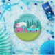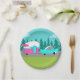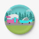 These Retro Camper / Trailer and Car Paper Plates feature a mid century modern, minimalist cartoon drawing that will leave you ready to take to the open road. An homage to the 1950s, this design features a vintage turquoise car with white top, pulling a kitschy travel trailer to its final destination. The perfectly restored, retro RV has a hot pink lower half, white top half, and a turquoise lightning bolt separating the two. The door in the side of the camper is also turquoise. The final accent is the hot pink wing protruding from the back of this home on wheels. The happy campers are motoring down a grey road. The roadway is surrounded by lush, green grass. In the background, we can see the teal silhouettes of a veritable forest of cedar trees, against an aqua sky with puffy, light blue clouds. This design is perfect for everyone from retired hippies, fledgling hipsters, or anyone who wants to relive some great childhood memories. The best part is that no one is asking, "Are we there yet?"