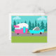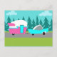 This Retro Camper / Trailer and Car Postcard features a mid century modern, minimalist cartoon drawing that will leave you ready to take to the open road. An homage to the 1950s, this design features a vintage turquoise car with white top, pulling a kitschy travel trailer to its final destination. The perfectly restored, retro RV has a hot pink lower half, white top half, and a turquoise lightning bolt separating the two. The door in the side of the camper is also turquoise. The final accent is the hot pink wing protruding from the back of this home on wheels. The happy campers are motoring down a grey road. The roadway is surrounded by lush, green grass. In the background, we can see the teal silhouettes of a veritable forest of cedar trees, against an aqua sky with puffy, light blue clouds. This design is perfect for everyone from retired hippies, fledgling hipsters, or anyone who wants to relive some great childhood memories. The best part is that no one is asking, "Are we there yet?"