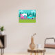 This Retro Camper / Trailer and Car Poster features a mid century modern, minimalist cartoon drawing that will leave you ready to take to the open road. An homage to the 1950s, this design features a vintage turquoise car with white top, pulling a kitschy travel trailer to its final destination. The perfectly restored, retro RV has a hot pink lower half, white top half, and a turquoise lightning bolt separating the two. The door in the side of the camper is also turquoise. The final accent is the hot pink wing protruding from the back of this home on wheels. The happy campers are motoring down a grey road. The roadway is surrounded by lush, green grass. In the background, we can see the teal silhouettes of a veritable forest of cedar trees, against an aqua sky with puffy, light blue clouds. This design is perfect for everyone from retired hippies, fledgling hipsters, or anyone who wants to relive some great childhood memories. The best part is that no one is asking, "Are we there yet?"