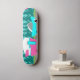 This Retro Camper / Trailer and Car Skateboard features a mid century modern, minimalist cartoon drawing that will leave you ready to take to the open road. An homage to the 1950s, this design features a vintage turquoise car with white top, pulling a kitschy travel trailer to its final destination. The perfectly restored, retro RV has a hot pink lower half, white top half, and a turquoise lightning bolt separating the two. The door in the side of the camper is also turquoise. The final accent is the hot pink wing protruding from the back of this home on wheels. The happy campers are motoring down a grey road. The roadway is surrounded by lush, green grass. In the background, we can see the teal silhouettes of a veritable forest of cedar trees, against an aqua sky with puffy, light blue clouds. This design is perfect for everyone from retired hippies, fledgling hipsters, or anyone who wants to relive some great childhood memories. The best part is that no one is asking, "Are we there yet?"