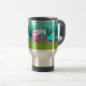This Retro Camper / Trailer and Car Travel Mug features a mid century modern, minimalist cartoon drawing that will leave you ready to take to the open road. An homage to the 1950s, this design features a vintage turquoise car with white top, pulling a kitschy travel trailer to its final destination. The perfectly restored, retro RV has a hot pink lower half, white top half, and a turquoise lightning bolt separating the two. The door in the side of the camper is also turquoise. The final accent is the hot pink wing protruding from the back of this home on wheels. The happy campers are motoring down a grey road. The roadway is surrounded by lush, green grass. In the background, we can see the teal silhouettes of a veritable forest of cedar trees, against an aqua sky with puffy, light blue clouds. This design is perfect for everyone from retired hippies, fledgling hipsters, or anyone who wants to relive some great childhood memories. The best part is that no one is asking, "Are we there yet?"