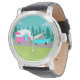 This Retro Camper / Trailer and Car Watch features a mid century modern, minimalist cartoon drawing that will leave you ready to take to the open road. An homage to the 1950s, this design features a vintage turquoise car with white top, pulling a kitschy travel trailer to its final destination. The perfectly restored, retro RV has a hot pink lower half, white top half, and a turquoise lightning bolt separating the two. The door in the side of the camper is also turquoise. The final accent is the hot pink wing protruding from the back of this home on wheels. The happy campers are motoring down a grey road. The roadway is surrounded by lush, green grass. In the background, we can see the teal silhouettes of a veritable forest of cedar trees, against an aqua sky with puffy, light blue clouds. This design is perfect for everyone from retired hippies, fledgling hipsters, or anyone who wants to relive some great childhood memories. The best part is that no one is asking, "Are we there yet?"