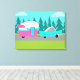This Retro Camper / Trailer and Car Stretched Canvas Print features a mid century modern, minimalist cartoon drawing that will leave you ready to take to the open road. An homage to the 1950s, this design features a vintage turquoise car with white top, pulling a kitschy travel trailer to its final destination. The perfectly restored, retro RV has a hot pink lower half, white top half, and a turquoise lightning bolt separating the two. The door in the side of the camper is also turquoise. The final accent is the hot pink wing protruding from the back of this home on wheels. The happy campers are motoring down a grey road. The roadway is surrounded by lush, green grass. In the background, we can see the teal silhouettes of a veritable forest of cedar trees, against an aqua sky with puffy, light blue clouds. This design is perfect for everyone from retired hippies, fledgling hipsters, or anyone who wants to relive some great childhood memories. The best part is that no one is asking, "Are we there yet?"