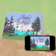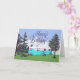 A cheerful turquoise blue vintage camper is set among pine trees with snow-covered mountains in the background. A peace sign resides on the side of the camper. "Happy Birthday" is artfully displayed on the front in dark purple. The pines are dark purple and green; the sky is a cornflower blue. The inside of the card reads: May your special day be filled with great fun and your year filled with true happiness. Happy Birthday!.