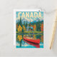 Capture the beauty of Canada with this vintage-style travel postcard featuring a cozy lakeside cabin, colorful autumn forest, snow-capped Rocky Mountains, and a classic red canoe reflected in the water.
