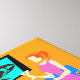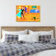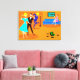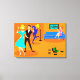 This Retro Cartoon Cocktail Party Stretched Canvas doesn't have an introverted bone in its body! The mid century modern design features a vibrant cartoon drawing of a living room and a lively cocktail party. There is an attractive couple on the dance floor. The blonde woman in a turquoise dress and her tall, dark and handsome escort are dancing the cha-cha. On the floor, there is a green record player surrounded by vinyl records. Against the far wall, a beautiful redhead is sitting on a blue sofa. She is wearing a bright pink dress. Her only accessory is the martini glass in her hand. To her side is a floor lamp minus the shade. Hmm… Where is the shade? It's on the head of a tipsy man in a blue suit who is clearly the life of the party. He's also holding a martini glass. Whoever decorated the room wasn't afraid of color. It has an orange brick wall and an orange floor. On the wall behind the sofa, there is a teal and turquoise painting of a globe with a black frame.