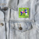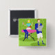 This Retro Cartoon Couple at Home Button is sizzling hot! It features a 1950's couple getting ready for the day. They are standing in a vibrant green room with a green brick wall behind them. To the side is a bright blue egg chair. Standing behind a hot pink ironing board, a pretty, blonde wife is holding an iron. She is wearing a simple turquoise house dress that looks suitable for a coronation. Around her waist, is a flouncy, white apron with a red waist band and accents. Her turquoise shoes perfectly match her dress. Of course they do! The woman's husband is standing off to the side, reading a newspaper. He is wearing a light blue dress shirt, orange tie and royal blue suit jacket. He would look all ready for work if his matching royal blue pants were not slung over the ironing board. He can't very well go to his office where he will perform mysterious tasks that no one quite understands in his white boxer shorts. Oh, my! What zany mayhem would ensue if he dared try that!