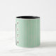 The Retro Cats Meow Mid-Century-Modern green mug comes in light, dusty green with a pale stripe pattern. It features a classic early 1950s - early 1960s style retro black cat with scowling emerald eyes and the words "Cat's Meow" spelled out on ivory diamonds. Please see our store for other items in this design and similar designs that you can mix and match