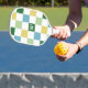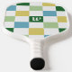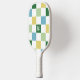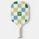 Retro Checker Pattern Monogram Pickleball Paddle features a blue, yellow and green check pattern, with your initial in a green square in the center of the pattern. A stylish, modern design for pickleball lovers.