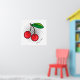 Funky retro popart style print of a red cherries illustration, over a circle of halftone black dots. Editable text wraps around the bottom corner of the artwork, for you to customize with names or a message