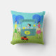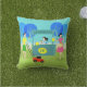 When life hands you lemons, it's time to buy this Retro Children's Lemonade Stand Outdoor Pillow. This nostalgic, 1960's style, minimalist art design features a wonderfully kitschy side of suburbia, where picket fences are plentiful and children are budding business entrepreneurs. The scene looks like it's straight out of a classic television show, with a young girl learning the value of a dollar while operating her vintage lemonade stand. The girl is wearing a blue dress, with a light blue pinafore. Her dark hair is pulled back in a bouncy ponytail. The stand itself was masterfully crafted by a master craftsman. It is painted in shades of teal, with a giant, yellow lemon proudly proclaiming the bargain price of $0.25! On the counter, there is a full pitcher of tangy, liquid refreshment. Our business girl is enjoying the fruits of her mother's labor, by sipping on a tall glass of lemonade. To the side, Mom is approaching, carrying another pitcher of freshly squeezed lemonade. She is wearing a bright, pink dress, with a yellow apron tied around her waist. It looks as if business is booming for the Princess of Lemonade. She appears to have made an easy sale to her father. Cha-ching! Standing on the lush green lawn, Dad is wearing green shorts and a yellow shirt that matches his wife's sunny disposition. He is standing behind a red lawnmower. We can see that he has already mowed a strip of grass, but, at this point, it's difficult to tell if he is working hard or hardly working. The mowing seems to be at a standstill while he enjoys a tangy glass of lemonade. Ah, refreshing! In the background, we can see mod, cartoon trees in shades of blue. They are perfectly backdropped by a sky in the shade of aqua reserved for Hometown, USA, in mid century modern artwork. The opposite side of this pillow is a cheery, aqua.