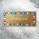 A colorful, whimsical gift voucher illustrated with colorful vintage Christmas tree lights on gold foil image backgound