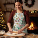 A Christmas baking apron with the retro flair of the 1950s! This charming apron takes a playful spin on nostalgia, featuring delightful mint green and pink doodles that transport you straight to a mid-century holiday kitchen. Christmas elements like cheerful snowmen, ice skates, and prancing reindeer, all set against a backdrop of soft, vintage-inspired colors.