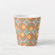 This mug has a mid-century modern design of concentric circles in 1970s colors with stars between each group.