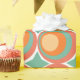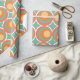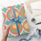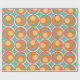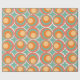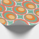 This wrapping paper has a mid-century modern design of concentric circles in 1970s colors with stars between each group.