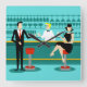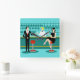Every hour is happy hour with this Retro Cocktail Lounge Acrylic Wall Clock. The mid century modern design features a vibrant, 1960's style, minimalist, cartoon drawing of a classy, cocktail bar. Against the backdrop of an aqua wall, we can see rows of drink glasses. At least we can see the teal silhouettes of drink glasses. Judging from the shapes of the stemware, this bar is well equipped to wet your whistle, whatever your drink preference. A most competent and personable bartender is manning the teal bar with yellow accents. The young barkeep is wearing a pristine, white shirt with black bow tie. His fresh-faced good looks, blond hair and black hipster glasses give us every reason to believe that he either spends his days as a struggling actor or a superhero. In one hand, the handsome mixologist is handing a martini to a customer on the opposite side of the bar. The waiting customer is a broad-shouldered gentleman in a black suit and red tie. He's the sort of fellow who is described as tall, dark, and handsome even when it's still hours until closing time. There seems to be a red and chrome bar stool with Mr. Debonair's name on it. Yet, not to be presumptuous, he asks the question, "Pardon me. Is this seat taken?" He is asking the raven haired gal on the neighboring bar stool. She's a real "girl next door" type, if you happen to live next door to a flawless beauty with a figure that won't quit. She is wearing a black dress and holding a martini in one hand. She's hoping that she and the approaching gentleman have more in common that their drink preference and choice of wardrobe color. It looks like this evening just got interesting. Cheers to you!