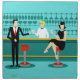 Every hour is happy hour with these Retro Cocktail Lounge Cloth Napkins. The mid century modern design features a vibrant, 1960's style, minimalist, cartoon drawing of a classy, cocktail bar. Against the backdrop of an aqua wall, we can see rows of drink glasses. At least we can see the teal silhouettes of drink glasses. Judging from the shapes of the stemware, this bar is well equipped to wet your whistle, whatever your drink preference. A most competent and personable bartender is manning the teal bar with yellow accents. The young barkeep is wearing a pristine, white shirt with black bow tie. His fresh-faced good looks, blond hair and black hipster glasses give us every reason to believe that he either spends his days as a struggling actor or a superhero. In one hand, the handsome mixologist is handing a martini to a customer on the opposite side of the bar. The waiting customer is a broad-shouldered gentleman in a black suit and red tie. He's the sort of fellow who is described as tall, dark, and handsome even when it's still hours until closing time. There seems to be a red and chrome bar stool with Mr. Debonair's name on it. Yet, not to be presumptuous, he asks the question, "Pardon me. Is this seat taken?" He is asking the raven haired gal on the neighboring bar stool. She's a real "girl next door" type, if you happen to live next door to a flawless beauty with a figure that won't quit. She is wearing a black dress and holding a martini in one hand. She's hoping that she and the approaching gentleman have more in common that their drink preference and choice of wardrobe color. It looks like this evening just got interesting. Cheers to you!