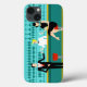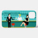 Every hour is happy hour with this Retro Cocktail Lounge iPhone 6 Case. The mid century modern design features a vibrant, 1960's style, minimalist, cartoon drawing of a classy, cocktail bar. Against the backdrop of an aqua wall, we can see rows of drink glasses. At least we can see the teal silhouettes of drink glasses. Judging from the shapes of the stemware, this bar is well equipped to wet your whistle, whatever your drink preference. A most competent and personable bartender is manning the teal bar with yellow accents. The young barkeep is wearing a pristine, white shirt with black bow tie. His fresh-faced good looks, blond hair and black hipster glasses give us every reason to believe that he either spends his days as a struggling actor or a superhero. In one hand, the handsome mixologist is handing a martini to a customer on the opposite side of the bar. The waiting customer is a broad-shouldered gentleman in a black suit and red tie. He's the sort of fellow who is described as tall, dark, and handsome even when it's still hours until closing time. There seems to be a red and chrome bar stool with Mr. Debonair's name on it. Yet, not to be presumptuous, he asks the question, "Pardon me. Is this seat taken?" He is asking the raven haired gal on the neighboring bar stool. She's a real "girl next door" type, if you happen to live next door to a flawless beauty with a figure that won't quit. She is wearing a black dress and holding a martini in one hand. She's hoping that she and the approaching gentleman have more in common that their drink preference and choice of wardrobe color. It looks like this evening just got interesting. Cheers to you!