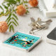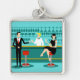 Every hour is happy hour with this Retro Cocktail Lounge Keychain. The mid century modern design features a vibrant, 1960's style, minimalist, cartoon drawing of a classy, cocktail bar. Against the backdrop of an aqua wall, we can see rows of drink glasses. At least we can see the teal silhouettes of drink glasses. Judging from the shapes of the stemware, this bar is well equipped to wet your whistle, whatever your drink preference. A most competent and personable bartender is manning the teal bar with yellow accents. The young barkeep is wearing a pristine, white shirt with black bow tie. His fresh-faced good looks, blond hair and black hipster glasses give us every reason to believe that he either spends his days as a struggling actor or a superhero. In one hand, the handsome mixologist is handing a martini to a customer on the opposite side of the bar. The waiting customer is a broad-shouldered gentleman in a black suit and red tie. He's the sort of fellow who is described as tall, dark, and handsome even when it's still hours until closing time. There seems to be a red and chrome bar stool with Mr. Debonair's name on it. Yet, not to be presumptuous, he asks the question, "Pardon me. Is this seat taken?" He is asking the raven haired gal on the neighboring bar stool. She's a real "girl next door" type, if you happen to live next door to a flawless beauty with a figure that won't quit. She is wearing a black dress and holding a martini in one hand. She's hoping that she and the approaching gentleman have more in common that their drink preference and choice of wardrobe color. It looks like this evening just got interesting. Cheers to you!