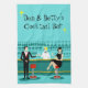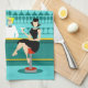 Every hour is happy hour with this Customizable Retro Cocktail Lounge Kitchen Towel. The mid century modern design features a vibrant, 1960's style, minimalist, cartoon drawing of a classy, cocktail bar. Against the backdrop of an aqua wall, we can see rows of drink glasses. At least we can see the teal silhouettes of drink glasses. Judging from the shapes of the stemware, this bar is well equipped to wet your whistle, whatever your drink preference. A most competent and personable bartender is manning the teal bar with yellow accents. The young barkeep is wearing a pristine, white shirt with black bow tie. His fresh-faced good looks, blond hair and black hipster glasses give us every reason to believe that he either spends his days as a struggling actor or a superhero. In one hand, the handsome mixologist is handing a martini to a customer on the opposite side of the bar. The waiting customer is a broad-shouldered gentleman in a black suit and red tie. He's the sort of fellow who is described as tall, dark, and handsome even when it's still hours until closing time. There seems to be a red and chrome bar stool with Mr. Debonair's name on it. Yet, not to be presumptuous, he asks the question, "Pardon me. Is this seat taken?" He is asking the raven haired gal on the neighboring bar stool. She's a real "girl next door" type, if you happen to live next door to a flawless beauty with a figure that won't quit. She is wearing a black dress and holding a martini in one hand. She's hoping that she and the approaching gentleman have more in common that their drink preference and choice of wardrobe color. It looks like this evening just got interesting. Cheers to you! Personalize to make an adorable accessory for your wet bar.