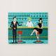 Every hour is happy hour with this Retro Cocktail Lounge Puzzle. The mid century modern design features a vibrant, 1960's style, minimalist, cartoon drawing of a classy, cocktail bar. Against the backdrop of an aqua wall, we can see rows of drink glasses. At least we can see the teal silhouettes of drink glasses. Judging from the shapes of the stemware, this bar is well equipped to wet your whistle, whatever your drink preference. A most competent and personable bartender is manning the teal bar with yellow accents. The young barkeep is wearing a pristine, white shirt with black bow tie. His fresh-faced good looks, blond hair and black hipster glasses give us every reason to believe that he either spends his days as a struggling actor or a superhero. In one hand, the handsome mixologist is handing a martini to a customer on the opposite side of the bar. The waiting customer is a broad-shouldered gentleman in a black suit and red tie. He's the sort of fellow who is described as tall, dark, and handsome even when it's still hours until closing time. There seems to be a red and chrome bar stool with Mr. Debonair's name on it. Yet, not to be presumptuous, he asks the question, "Pardon me. Is this seat taken?" He is asking the raven haired gal on the neighboring bar stool. She's a real "girl next door" type, if you happen to live next door to a flawless beauty with a figure that won't quit. She is wearing a black dress and holding a martini in one hand. She's hoping that she and the approaching gentleman have more in common that their drink preference and choice of wardrobe color. It looks like this evening just got interesting. Cheers to you!