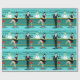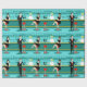 Every hour is happy hour with this Retro Cocktail Lounge Wrapping Paper. The mid century modern design features a vibrant, 1960's style, minimalist, cartoon drawing of a classy, cocktail bar. Against the backdrop of an aqua wall, we can see rows of drink glasses. At least we can see the teal silhouettes of drink glasses. Judging from the shapes of the stemware, this bar is well equipped to wet your whistle, whatever your drink preference. A most competent and personable bartender is manning the teal bar with yellow accents. The young barkeep is wearing a pristine, white shirt with black bow tie. His fresh-faced good looks, blond hair and black hipster glasses give us every reason to believe that he either spends his days as a struggling actor or a superhero. In one hand, the handsome mixologist is handing a martini to a customer on the opposite side of the bar. The waiting customer is a broad-shouldered gentleman in a black suit and red tie. He's the sort of fellow who is described as tall, dark, and handsome even when it's still hours until closing time. There seems to be a red and chrome bar stool with Mr. Debonair's name on it. Yet, not to be presumptuous, he asks the question, "Pardon me. Is this seat taken?" He is asking the raven haired gal on the neighboring bar stool. She's a real "girl next door" type, if you happen to live next door to a flawless beauty with a figure that won't quit. She is wearing a black dress and holding a martini in one hand. She's hoping that she and the approaching gentleman have more in common that their drink preference and choice of wardrobe color. It looks like this evening just got interesting. Cheers to you!