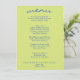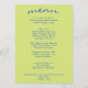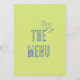 A colorful retro funky modern bright wedding dinner menu. Which features chic template design of boho vintage pale green background and blue typography and hand written menu in blue . And bright back green background. Perfect and matching with the whole suite.