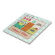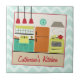 A kitchen tile featuring an illustration of a retro inspired kitchen decorated with a red, turquoise, orange, and yellow color scheme. Personalize with your name in red. Background is light blue with zig zags.