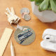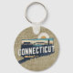 Round keychain features a scenic retro styled state silhouette of Connecticut on faux tan burlap background. Personalize with name or message on back.