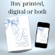 You can pick to download your custom Retro Coquette Blue Bow Bridal Shower Invitation in any of the following 4 file types: PNG, JPG, Standard PDF, and Print PDF. These 4 file formats have been selected so they cover all your inviting needs. PNG and JPG are great for sending your invitations online. All of these file formats are great if you want to print your invitations yourself. However, having unlimited downloads allows you to download all four formats for maximum versatility. You can even apply your digital download design to other popular products on Zazzle.