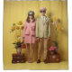Whimsical retro couple in pastel color clothes and sunglasses and a yellow background