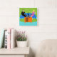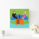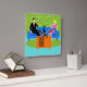 This Retro Couple with Cat Acrylic Wall Clock features a cartoon couple trying to get cozy while watching television on a mid century modern, blue sofa. The cat, however, has other ideas. On one side of the sofa, there is a handsome man in a black suit with red tie. On the other side of the stylish couch, there is a beautiful, blonde woman in a form fitting, hot pink dress. Things would be going great if it weren't for the sleek black cat, which has laid claim to the center sofa cushion. This 1960's style, minimalist art design is set in a stylish living room. The sofa's backdrop is a green, stone wall. On the aqua floor, there is a round, green shag rug, which matches the stone wall. At the forefront of the design, we see the back of an orange television set with rabbit ears, which seems to be playing the cat's favorite TV program.