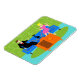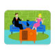This Retro Couple with Cat Flexible Magnet features a cartoon couple trying to get cozy while watching television on a mid century modern, blue sofa. The cat, however, has other ideas. On one side of the sofa, there is a handsome man in a black suit with red tie. On the other side of the stylish couch, there is a beautiful, blonde woman in a form fitting, hot pink dress. Things would be going great if it weren't for the sleek black cat, which has laid claim to the center sofa cushion. This 1960's style, minimalist art design is set in a stylish living room. The sofa's backdrop is a green, stone wall. On the aqua floor, there is a round, green shag rug, which matches the stone wall. At the forefront of the design, we see the back of an orange television set with rabbit ears, which seems to be playing the cat's favorite TV program.