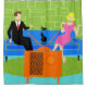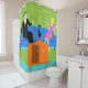 This Retro Couple with Cat Shower Curtain features a cartoon couple trying to get cozy while watching television on a mid century modern, blue sofa. The cat, however, has other ideas. On one side of the sofa, there is a handsome man in a black suit with red tie. On the other side of the stylish couch, there is a beautiful, blonde woman in a form fitting, hot pink dress. Things would be going great if it weren't for the sleek black cat, which has laid claim to the center sofa cushion. This 1960's style, minimalist art design is set in a stylish living room. The sofa's backdrop is a green, stone wall. On the aqua floor, there is a round, green shag rug, which matches the stone wall. At the forefront of the design, we see the back of an orange television set with rabbit ears, which seems to be playing the cat's favorite TV program.