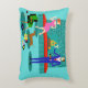 This Retro Couple with Dog Accent Pillow looks like a scene out of a romantic comedy. The 1960s's style, minimalist art design features an attractive couple enjoying a romantic evening at home. The sophisticated room prominently features an aqua and teal brick fireplace with a bright red ledge. A beautiful, redhead woman wearing a bright, pink dress is perched on the ledge. She is enjoying a martini with a floating olive, a roaring fire, good music, and the company a tall, dark and handsome man. The man is wearing a blue suit and red tie. His martini glass is raised to toast his charming companion. In his other hand, he is holding a vinyl record album. At his feet, we see a most adorable dachshund wearing a red collar. The playful wiener dog is walking in the direction of a green record player with orange, spindle legs. On the floor, there is a colorful group of fun, eclectic, vinyl records. The opposite side of this kitschy throw pillow has an aqua and teal brick pattern. Cheers! Here's to the perfect evening at home.