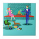 This Retro Couple with Dog Ceramic Tile looks like a scene out of a romantic comedy. The 1960s's style, minimalist art design features an attractive couple enjoying a romantic evening at home. The sophisticated room prominently features an aqua and teal brick fireplace with a bright red ledge. A beautiful, redhead woman wearing a bright, pink dress is perched on the ledge. She is enjoying a martini with a floating olive, a roaring fire, good music, and the company a tall, dark and handsome man. The man is wearing a blue suit and red tie. His martini glass is raised to toast his charming companion. In his other hand, he is holding a vinyl record album. At his feet, we see a most adorable dachshund wearing a red collar. The playful wiener dog is walking in the direction of a green record player with orange, spindle legs. On the floor, there is a colorful group of fun, eclectic, vinyl records. Cheers! Here's to the perfect evening at home.