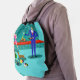 This Retro Couple with Dog Drawstring Backpack looks like a scene out of a romantic comedy. The 1960s's style, minimalist art design features an attractive couple enjoying a romantic evening at home. The sophisticated room prominently features an aqua and teal brick fireplace with a bright red ledge. A beautiful, redhead woman wearing a bright, pink dress is perched on the ledge. She is enjoying a martini with a floating olive, a roaring fire, good music, and the company a tall, dark and handsome man. The man is wearing a blue suit and red tie. His martini glass is raised to toast his charming companion. In his other hand, he is holding a vinyl record album. At his feet, we see a most adorable dachshund wearing a red collar. The playful wiener dog is walking in the direction of a green record player with orange, spindle legs. On the floor, there is a colorful group of fun, eclectic, vinyl records. Cheers! Here's to the perfect evening at home.