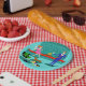 These Retro Couple with Dog Paper Plates look like a scene out of a romantic comedy. The 1960s's style, minimalist art design features an attractive couple enjoying a romantic evening at home. The sophisticated room prominently features an aqua and teal brick fireplace with a bright red ledge. A beautiful, redhead woman wearing a bright, pink dress is perched on the ledge. She is enjoying a martini with a floating olive, a roaring fire, good music, and the company a tall, dark and handsome man. The man is wearing a blue suit and red tie. His martini glass is raised to toast his charming companion. In his other hand, he is holding a vinyl record album. At his feet, we see a most adorable dachshund wearing a red collar. The playful wiener dog is walking in the direction of a green record player with orange, spindle legs. On the floor, there is a colorful group of fun, eclectic, vinyl records. Cheers! Here's to the perfect evening at home.