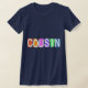 Retro-style COUSIN design with white text on colorful background squares. Text creates different effect on dark or light backgrounds. Change the style or color to make this your own! Add text to the front or back. This makes a great gift idea for your cousin on her or his birthday, graduation or any other special day.