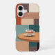 Stylized coffee cup on a rounded table, with curved steam and a geometric retro background.