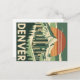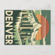 A retro-style travel poster features the Denver skyline nestled at the base of a large, snow-capped mountain range under a striped sun, surrounded by pine trees, with "DENVER" prominently displayed at the bottom.