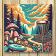 A unique colorful disc golf course in a field of retro mushrooms, pine trees and clouds in vintage colors like orange, blue and red.