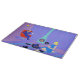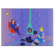This Retro Evening at Home Cutting Board looks like a scene out of a 1960's romantic comedy. The minimalist design features an attractive cartoon couple in the living room of a mid century modern house. The room prominently features a purple and blue stone wall and a matching purple and blue striped rug. Against the wall, there is a turquoise, cone shaped fireplace with a roaring fire. In the corner, the suave man of the house is lounging in a red egg chair. He is wearing a blue suit with a blue tie. In one hand, he is holding a martini glass. No wonder he's so relaxed! Hanging from the ceiling, there is a yellow, Sputnik light fixture. A woman with an hourglass figure is sitting on the rug. She is wearing a vibrant, blue dress and not a hair is out of place in her flippy blonde "do". Beside her, on the floor, there is a blue and black portable record player. Several vinyl record albums are scattered near the beautiful deejay. Go ahead and sing along. You know you want to!