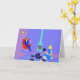 This Retro Evening at Home Greeting Card looks like a scene out of a 1960's romantic comedy. The minimalist design features an attractive cartoon couple in the living room of a mid century modern house. The room prominently features a purple and blue stone wall and a matching purple and blue striped rug. Against the wall, there is a turquoise, cone shaped fireplace with a roaring fire. In the corner, the suave man of the house is lounging in a red egg chair. He is wearing a blue suit with a blue tie. In one hand, he is holding a martini glass. No wonder he's so relaxed! Hanging from the ceiling, there is a yellow, Sputnik light fixture. A woman with an hourglass figure is sitting on the rug. She is wearing a vibrant, blue dress and not a hair is out of place in her flippy blonde "do". Beside her, on the floor, there is a blue and black portable record player. Several vinyl record albums are scattered near the beautiful deejay. Go ahead and sing along. You know you want to! The inside of the card is blank to allow for your own sentiment.