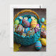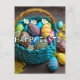 This holiday postcard features several colorful Easter eggs resting in a hand-made basket.