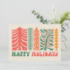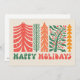This vibrant holiday card embraces a retro design featuring a series of stylized trees in shades of red, orange, and green, each with its own unique, decorative pattern. The trees are adorned with stars, berries, and festive branches, evoking a sense of holiday cheer and whimsy. The words "Happy Holidays" are displayed in bold, playful font at the bottom, adding a nostalgic touch to this delightful design. Perfect for sending joyful greetings during the festive season with a vintage flair.
