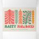 This vibrant holiday card embraces a retro design featuring a series of stylized trees in shades of red, orange, and green, each with its own unique, decorative pattern. The trees are adorned with stars, berries, and festive branches, evoking a sense of holiday cheer and whimsy. The words "Happy Holidays" are displayed in bold, playful font at the bottom, adding a nostalgic touch to this delightful design. Perfect for sending joyful greetings during the festive season with a vintage flair.